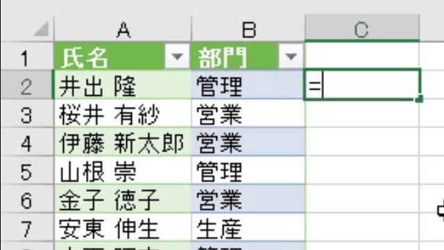 上のGIF画像のように「=」を使用して「部門」列を参照すると、一気に「部門」列内の値が抽出されます