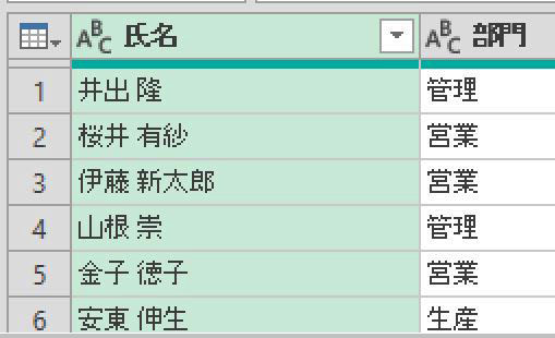 下の画像のように、エディタ内に「氏名」「部門」という列名の列があるデータがあるとします