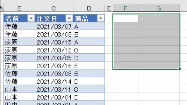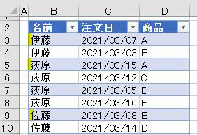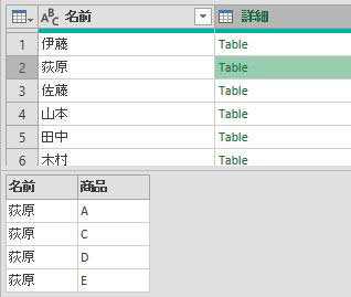 名前の列をグループ化し、グループ毎に「商品列に含まれる商品」を1つのセルに出力します