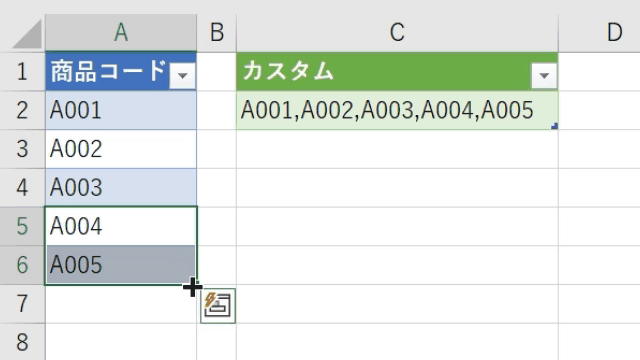 【M言語は難しくない】今回は複数行に拡散している値を、次のGIF画像のように「記号」をつなぎ目にして、1つのセルにまとめます