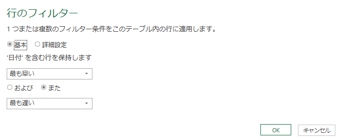 こちらのカスタムフィルターの画面で「また」を選択した上で、2つの値を次の画像のように「最も早い」「最も遅い」と指定します