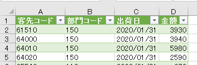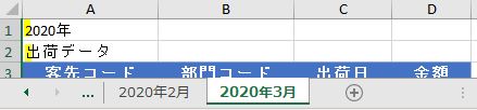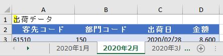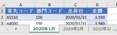 2020年1月のデータは1行目から始まっていますが、2月のデータは2行目から始まります