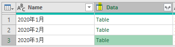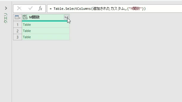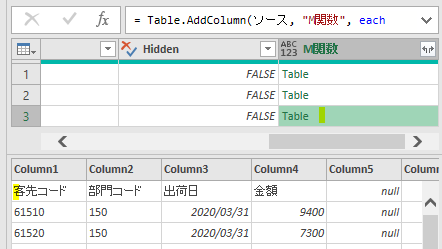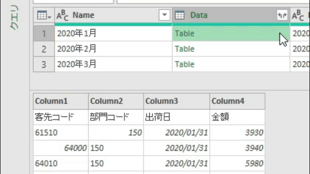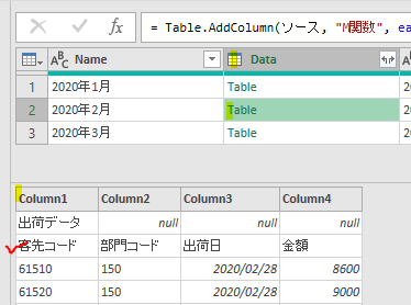 次からはこの「Data」列を活用して、カスタム列をM関数により作成します