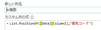 行見出し位置を取得するには、行見出しにある「客先コード」をキーにして、M関数「List.PositionOf」を使います