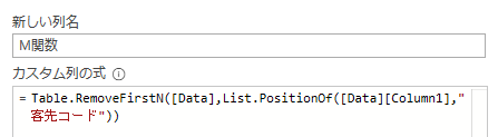 List.PositionOf関数により行見出しの位置は抽出できましたので、「行見出しの位置-1」分の行数をM関数/Table.RemoveFirstNを使用して削除します