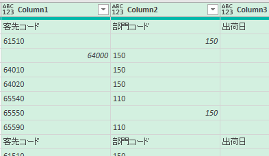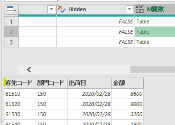 1行目の内容では、客先コードは1行目にありますがM言語のベースに従って0と出力されています