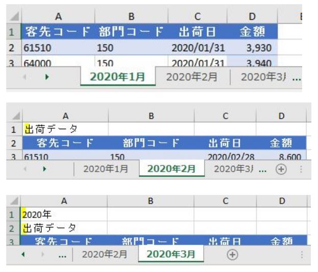 但し、前述のように3つのシートそれぞれの行見出し位置が違います
