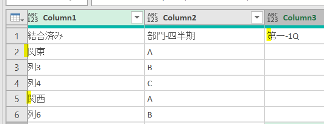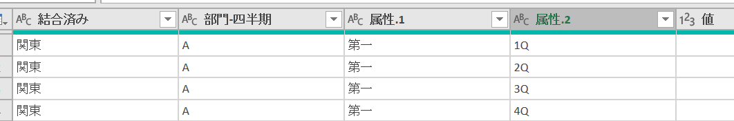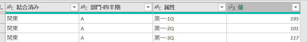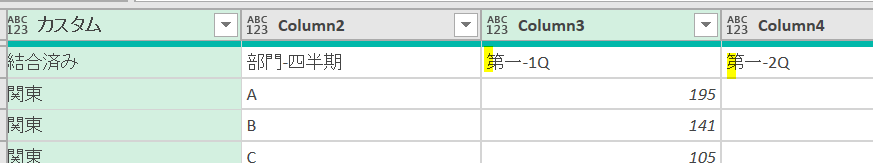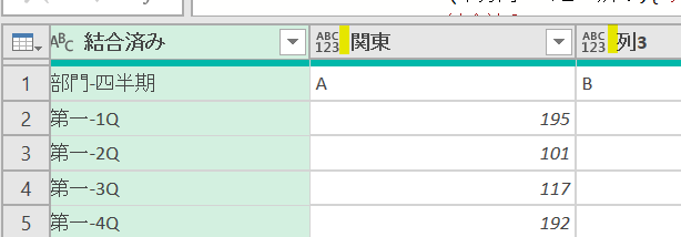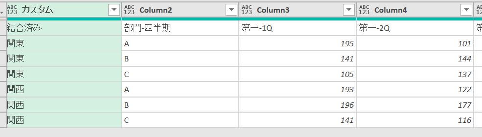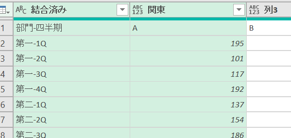 後でデータを扱いやすくするために、部門と四半期の列は「列のマージ」により1列にまとめてしまいます