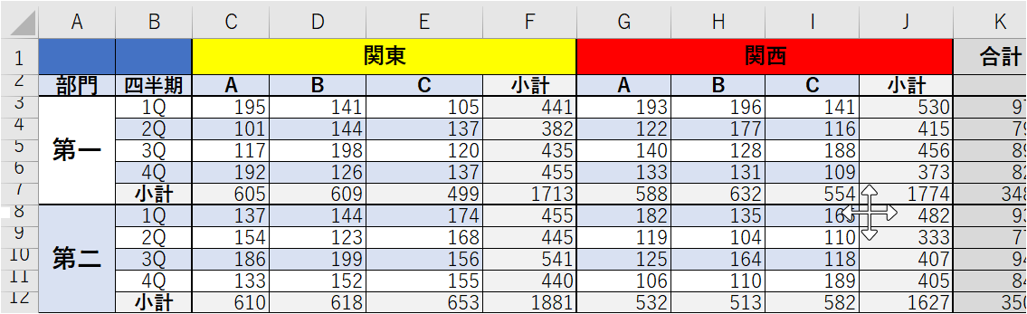 今回は行列ともにセル結合がある表を扱いますが、行方向のみの場合は過去にも記事を書いてますので、ぜひそちらもご参照ください ⇒過去の記事