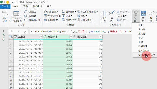 ところが、Power Queryでは直観的にクリック操作していけば、このユニークな数を集計できます