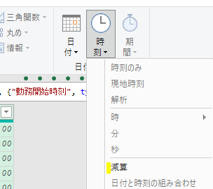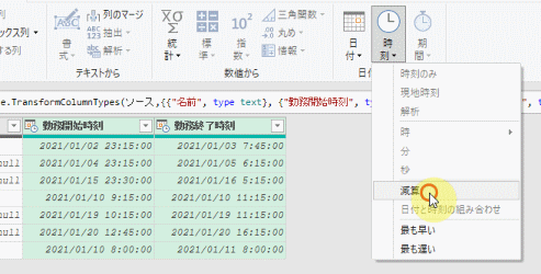 次に「列の追加」タブから「時刻」⇒「減算」と順にクリックしてください