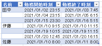 今回は、名前の列に空欄がある下の表から3つの「経過時間」を計算します