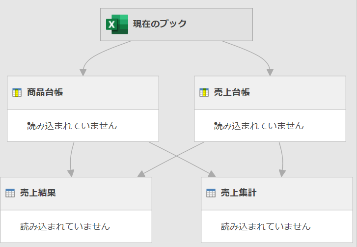 上の画像の「売上集計」クエリは、「商品台帳クエリ」「売上台帳クエリ」などのクエリと依存関係(他のクエリをマージ)になっています