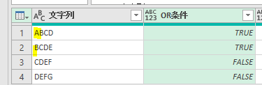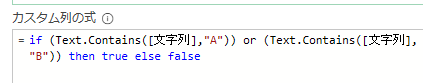 if (Text.Contains([文字列],”A”)=true) or (Text.Contains([文字列],”B”)) then true else false