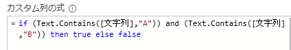 if (Text.Contains([文字列],”A”)) and (Text.Contains([文字列],”B”)) then true else false