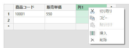 もし、行列のどちらかを削除したい場合には、該当する行列の上で右クリックすると次の画像が出て削除が行えます