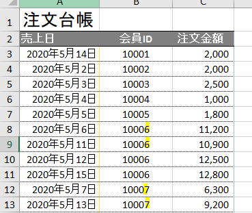 上の画像では2回目の注文があった会員に黄色の印を付けましたが、2回目の注文があった会員もいれば、そうでない会員もいます