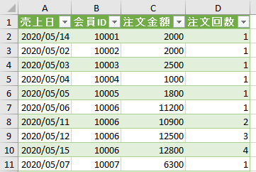 他のデータを会員別に紐づければ、2回目の注文があった会員とそうでない会員の購入している商品の違いなども調べることができるはずです