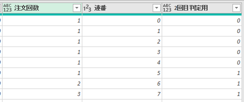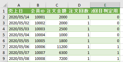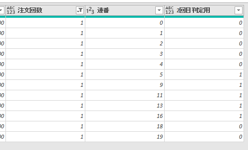こうすれば注文回数の列は「1」のみ、2回目判定用の列は0か1になります
