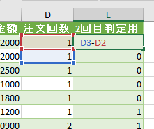 つまり上の画像内では、注文回数列をA列だとすると<=A3-A2>と同様の計算が行われています