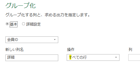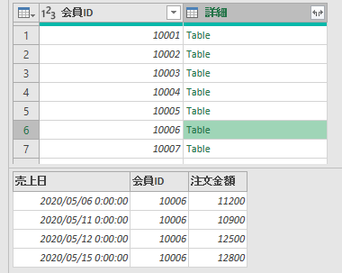会員ID別(会員番号別)に「すべての行」でグループ化を行い、会員ID別にテーブルを作成します