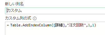 次にカスタム列・作成画面にて、テーブル別にM関数/Table.AddIndexColumnを使用して連番を付与します