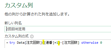 上の画像にて黄色の印を付けた波括弧内は、注文回数の各行の1つ下の行番号の値になります([注文回数]の前のDataは前ステップの名称になります)