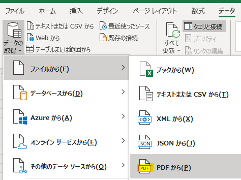 データタブの「データ取得」から「ファイルから」⇒「PDFから」を指定します