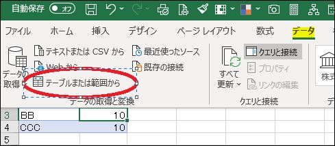 ➀データ上にカーソルを置いて、データタブから”テーブルまたは範囲から”をクリックします
