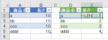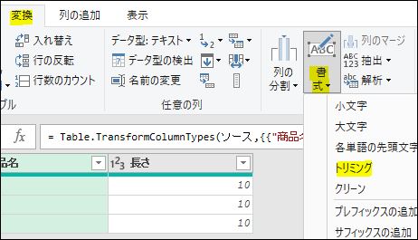 トリミングを行った右側の「商品名」は空白が混ざっていないので、文字列が見た目通りの長さになっています