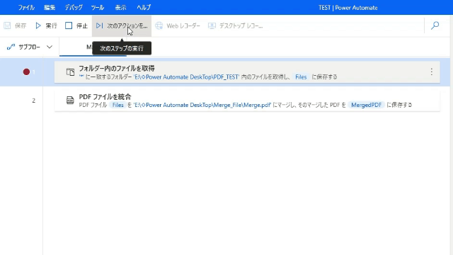 その後の2つ目のアクションで予め指定されたPDFファイルに、取得したファイルの内容を結合します