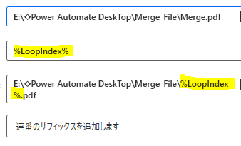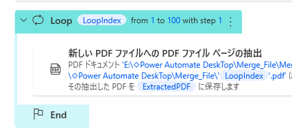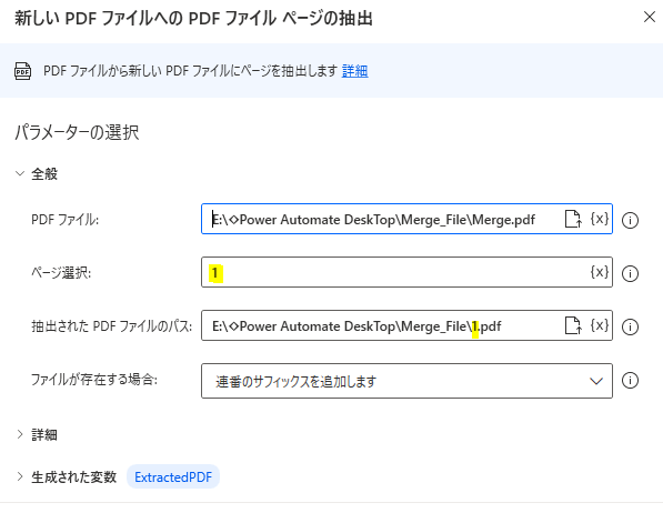 こちらの「新しいPDFファイルへのPDFファイルページの抽出」内には変数を設定します