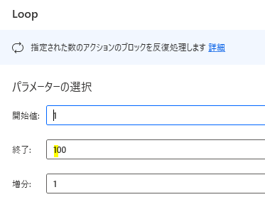 下の図のように繰返し処理をするアクション内で、終了値を100というあり得ない数字で設定しておきます