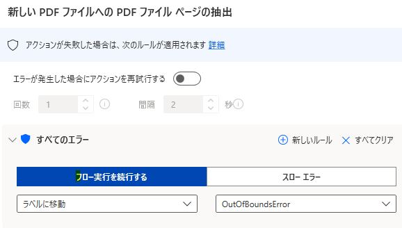 次に「新しいPDFファイルへのPDFファイルページの抽出」アクションにて「元ファイル名」「ページの選択」「出力ファイル名」の3つを指定します