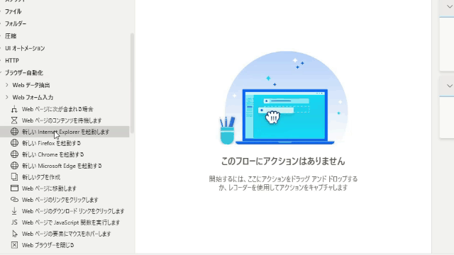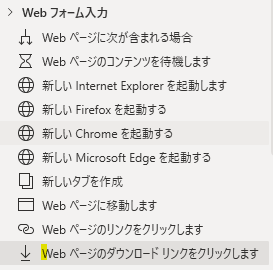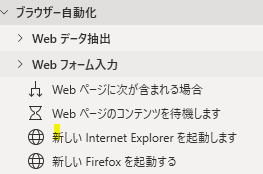 下の画像の「ブラウザー自動化➡Webフォーム入力」から該当のアクションを選択します