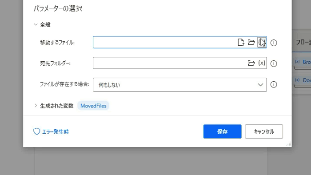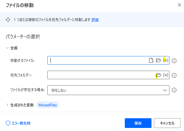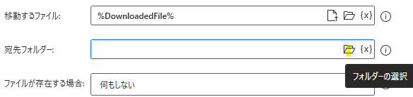まず移動するファイルですが、こちらは前述のd:ダウンロードしたファイル、つまり変数「DownloadedFile」を指定します
