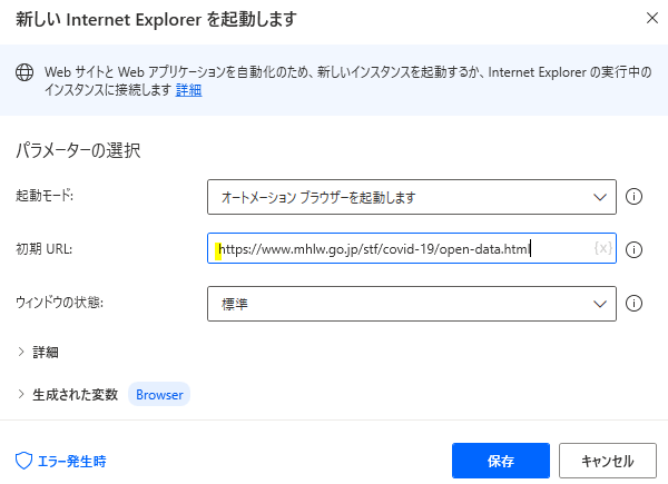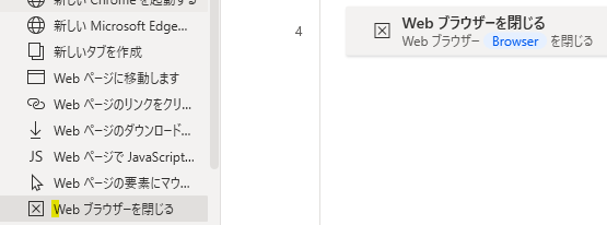 こちらのアクションの中味には自動で開いたアクションで自動設定された「Browser」がこちらにも自動設定されます
