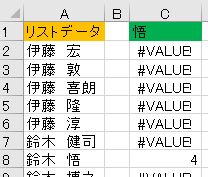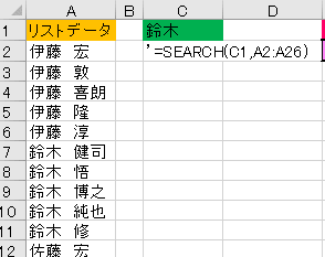 1段階目 ➡ SEARCH(C1セル/検索文字,A列/リストデータ)