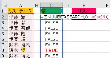 b:ISNUMBER(SEARCH(C1セル/検索文字,A列/リストデータ)) _