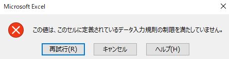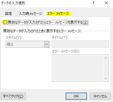 上の画像の黄色の箇所「無効なデータが入力されたらエラーメッセージを表示する」のチェックを外します