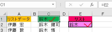 C1セルに設定した、E2セルとの連動式(=E2)を一旦外し、「鈴木」と入力してみます
