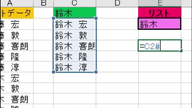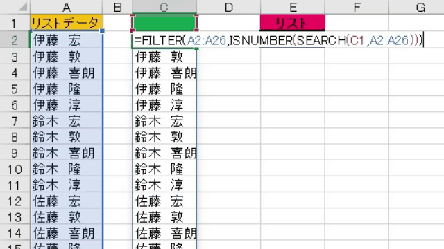 検索文字の「鈴木」を含む候補データが、A列のリストデータから抽出されています