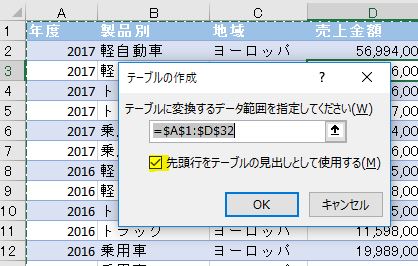 すると次のようなポップアップが出るので”先頭行をテーブルの見出しとして使用する”にチェックを入れてOKボタンを押しましょう!これで表をテーブルとして使用できます