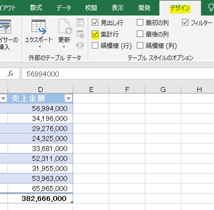 この集計行にチェックを入れる作業だけで、既に売上金額の合計(382,666,000)が計算されています!