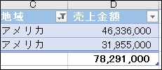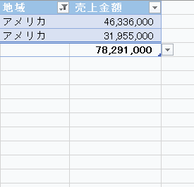 フィルターで地域の抽出範囲を変えただけで合計金額が変わっているのが分かりますでしょうか?このテーブル機能の集計行は完全にフィルターの集計結果と連動していますので、様々な計算結果を得られます