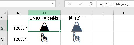 特殊フォントの使用の仕方は複数あるのですが、今回はUNICHAR関数という関数を使いました
