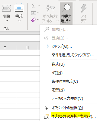➀画面上のホームタブから⇒オブジェクトの選択と表示をクリック
