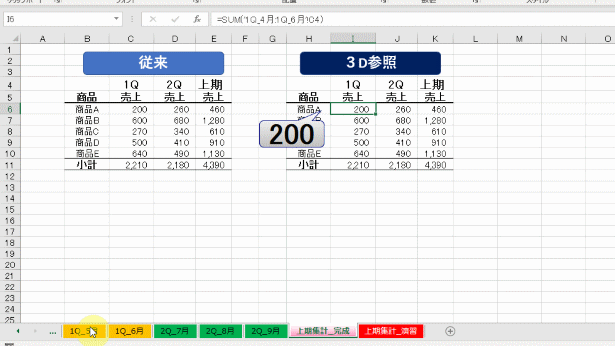 一方、今回の回で紹介する3D参照では、一気に複数シートをSUM関数で集計することができます