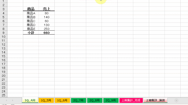 例えば、シート名を四半期単位で集計できるように工夫しておきます