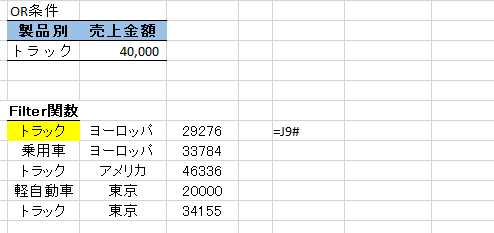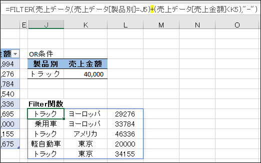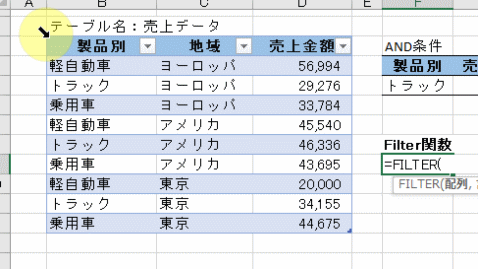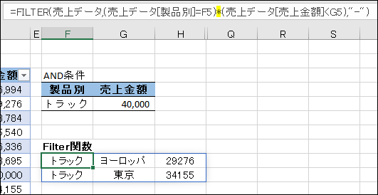 ()内の条件(製品別=トラック、売上金額<40000)を*で組み合わせています